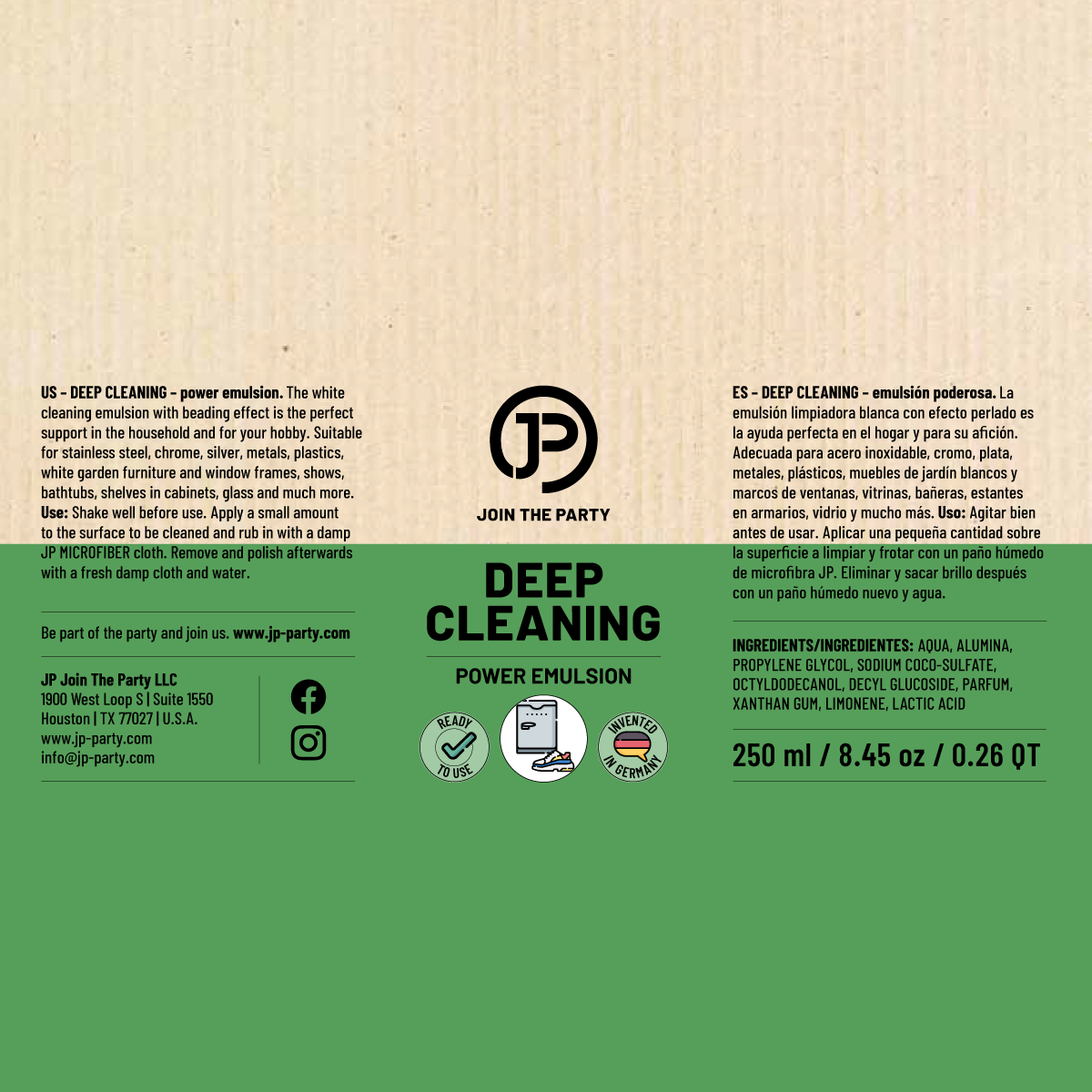 Shake well before use. Apply a small amount to the surface to be cleaned and rub in with a damp JP-microfiber cloth. Remove and polish afterwards with a fresh damp cloth and water. Suitable for stainless steel, chrome, silver, metals, plastics, white garden furniture and window frames, shows, bathtubs, shelves in cabinets, glass, and much more.