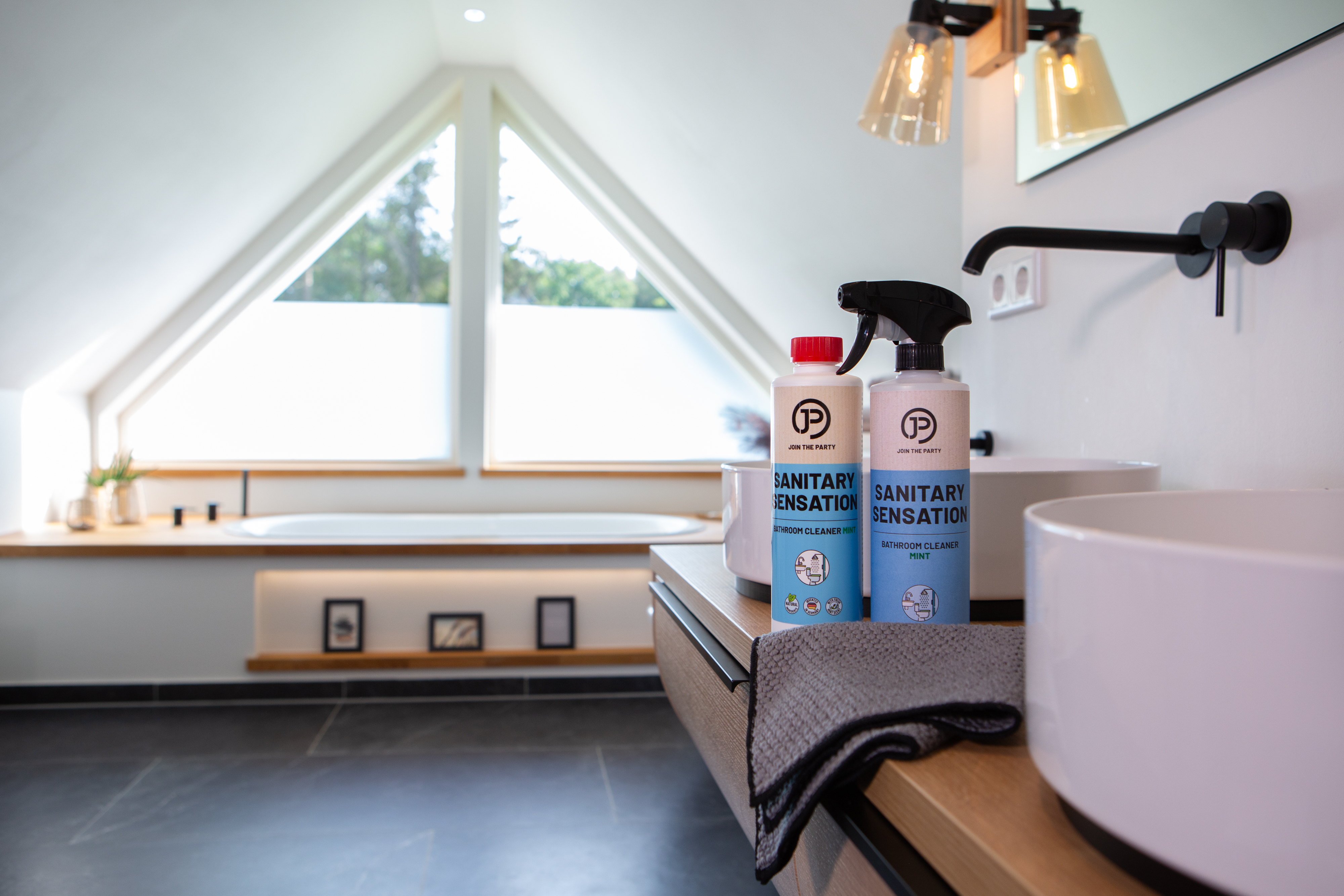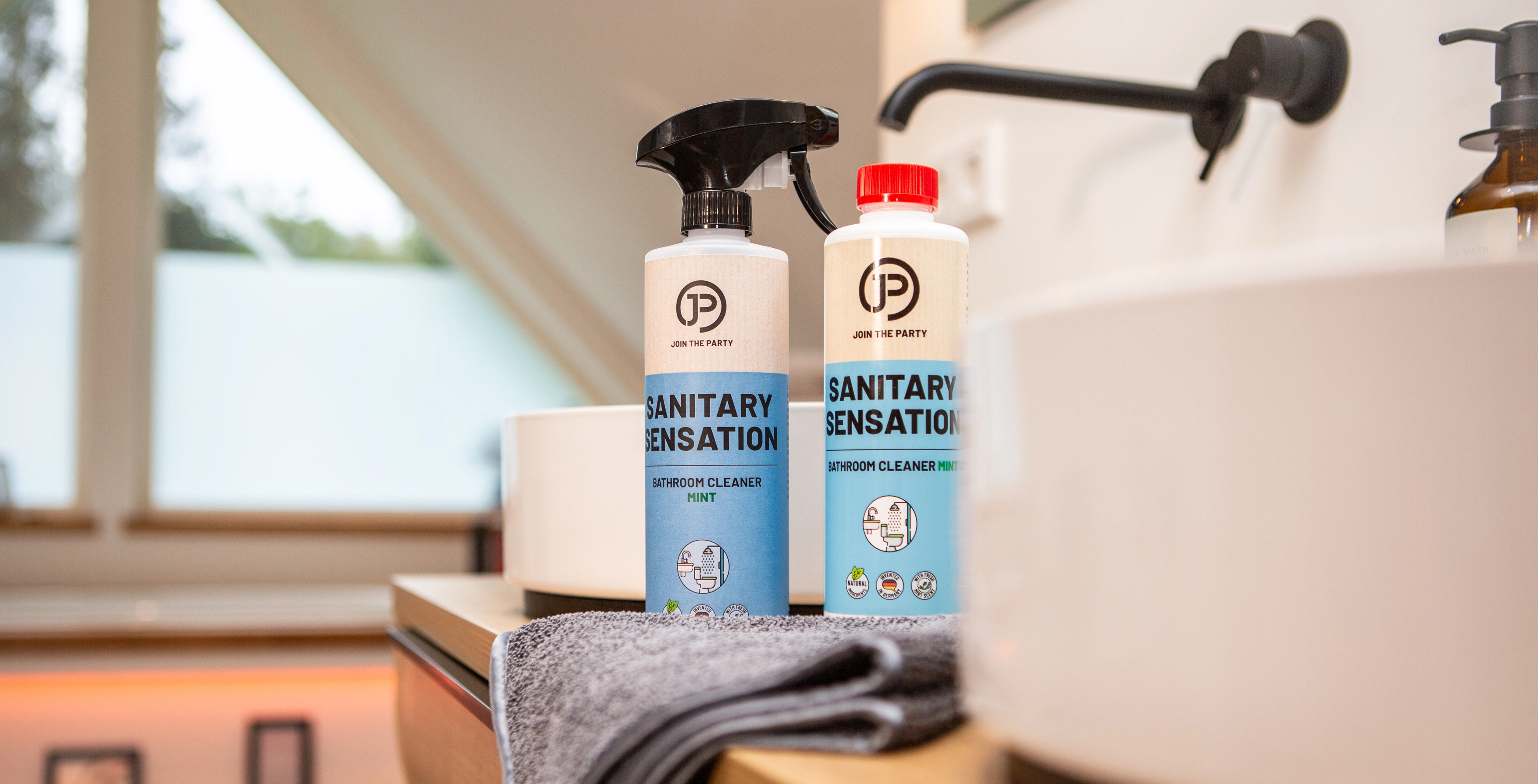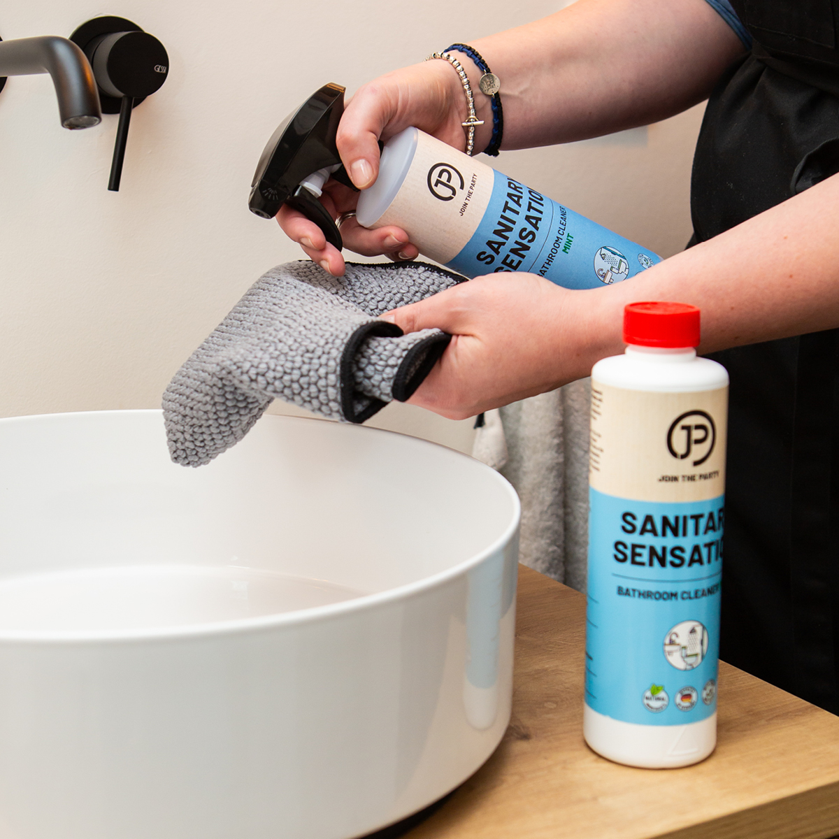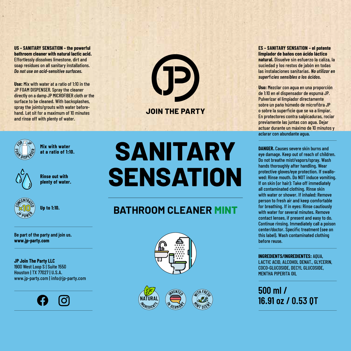 Mix with water at a ratio of 1:10 in the JP foam dispenser. Pump the cleaner directly on a damp JP microfiber cloth or the surface to be cleaned. (Sanitary objects, tiles, fittings, glass and plastic surfaces, shower partitions, etc.). For backsplashes: spray the joints/grout with water beforehand. Let it sit for a maximum of 10 minutes and rinse off with plenty of water.